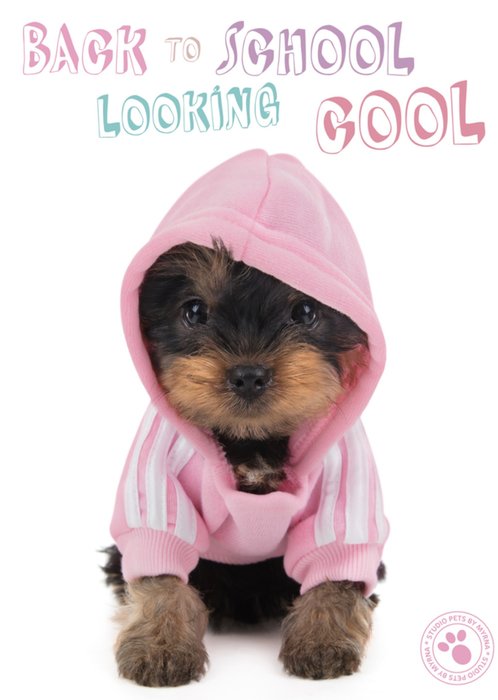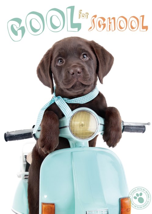 Leuke back to school kaart met een hondje op een scooter.