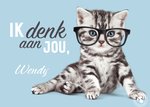 Wenskaart van Studio Pets met lieve en grappige dieren gefotografeerd door Myrna. Voeg je eigen foto('s), tekst, & versiering toe om de kaart extra persoonlijk te maken. Je kunt de kaart toevoegen aan je favorieten of tussentijds opslaan om deze later af te maken. Toch op zoek naar een ander design? Bekijk alle denken aan-kaarten.Laat weten dat je aan haar denkt. De naam in de kaart is aanpasbaar. Naast de tekst zit een schattig poesje met een bril op.
