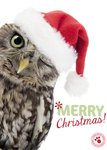 Een schattige witte kerstkaart met een uil om iemand een fijne kerst mee te wensen met de tekst: Merry christmas.