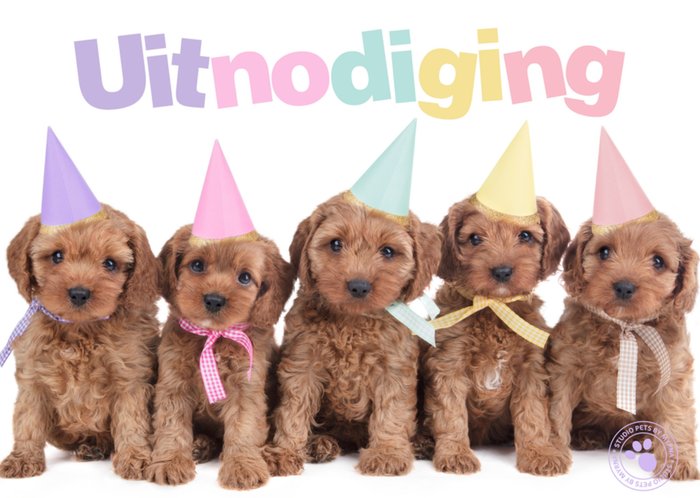 Nodig vrienden en familie uit met deze schattige kaart. De hondjes op de voorkant hebben hun feestmuts al op.