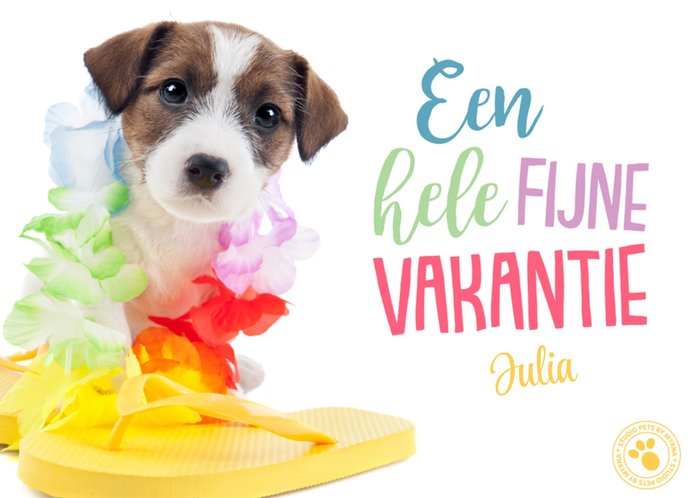 Wens iemand een hele fijne vakantie met dit schattige kaartje. Het hondje zit naast slippers en heeft een Hawaïaanse slinger om zijn nek. Rechts daarnaast staat de tekst "Een hele fijne vakantie" + de naam van de ontvanger.