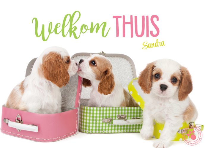 Verwelkom een vakantieganger met dit schattige kaartje. De hondjes zitten in de openstaande koffertjes met daarbij de tekst: welkom thuis + naam.