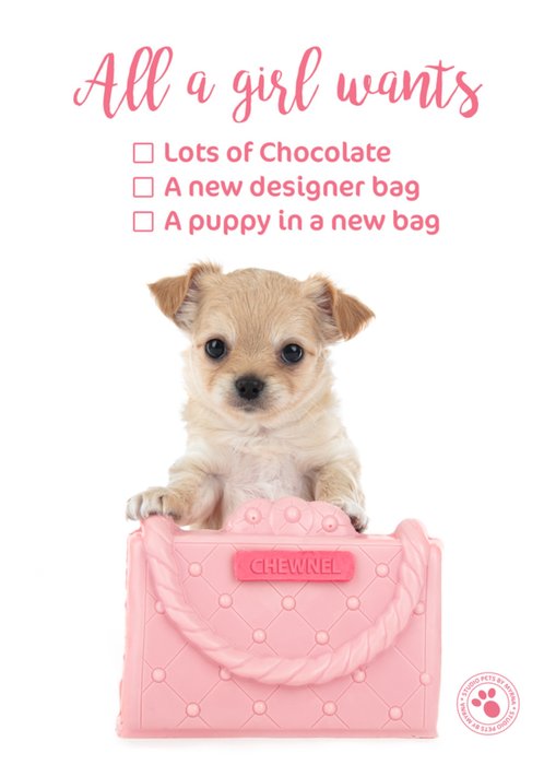 Studio Pets | Verjaardagskaart | All A Girl Wants | Funny Puppy In Pink Handbag