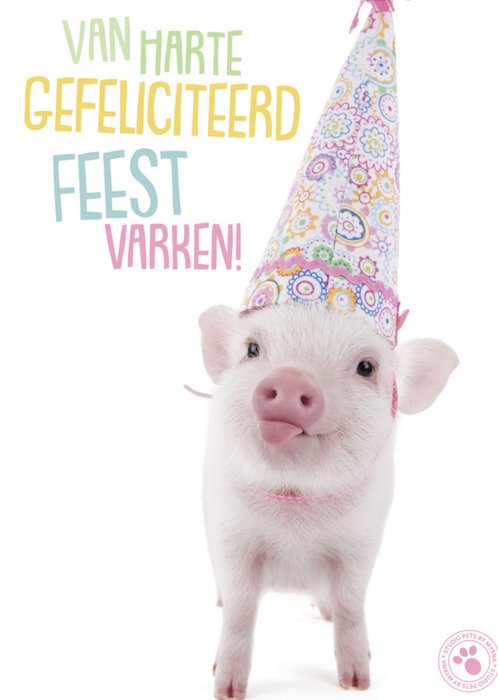 Wat een lieve kaart van Studio Pets! Op deze kaart staat een varkentje en de tekst: van harte gefeliciteerd feest varken!