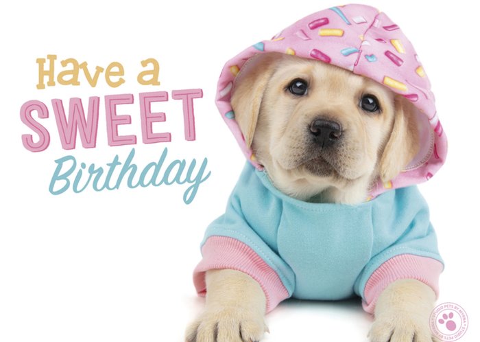 Schattige verjaardagskaart met een hondje en de tekst: Have a sweet birthday.
