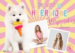 Kleurrijke verjaardagskaart met een foto van een hondje, een gele en roze achtergrond, aanpasbare fotos en de tekst: 'Dat wordt een heerlijke verjaardag'. Verras de jarige met deze fotografische verjaardagskaart van Studio Pets.