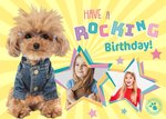 Kleurrijke verjaardagskaart met een foto van een hondje, een gele achtergrond, sterren, aanpasbare fotos en de tekst: 'Have a rocking birthday!'. Verras de jarige met deze fotografische verjaardagskaart van Studio Pets.