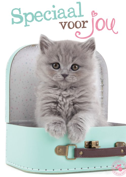 Witte, schattige wenskaart van Studio Pets, met kitten in een koffer op de voorkant.