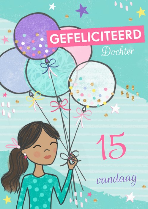 Leuke verjaardagskaart met de tekst: Gefeliciteerd dochter 15 vandaag