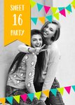 Vrolijke uitnodiging van Greetz, met een eigen foto. Op de voorkant staan trendy vlaggetjes.