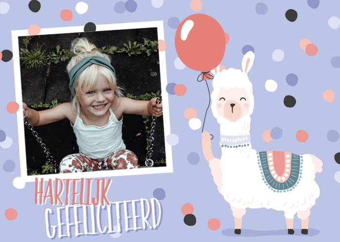 Leuke wenskaart met aanpasbare foto en illustratie van een alpaca.