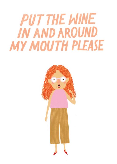Grappige verjaardagskaart met illustratie en de tekst: Put the wine in and around my mouth please.