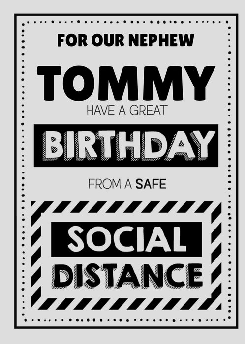Leuke en vrolijke verjaardagskaart van The dogs doo-dahs. Op deze verjaardagskaart staat de tekst: For our nephew [naam] have a great birthday from a safe social distance.