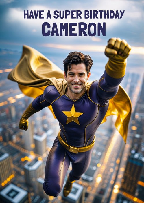 Met een vliegende superheld met een face-swap foto-upload, gekleed in een marineblauw pak met een sterembleem en een goudkleurige cape, boven een skyline van de stad.