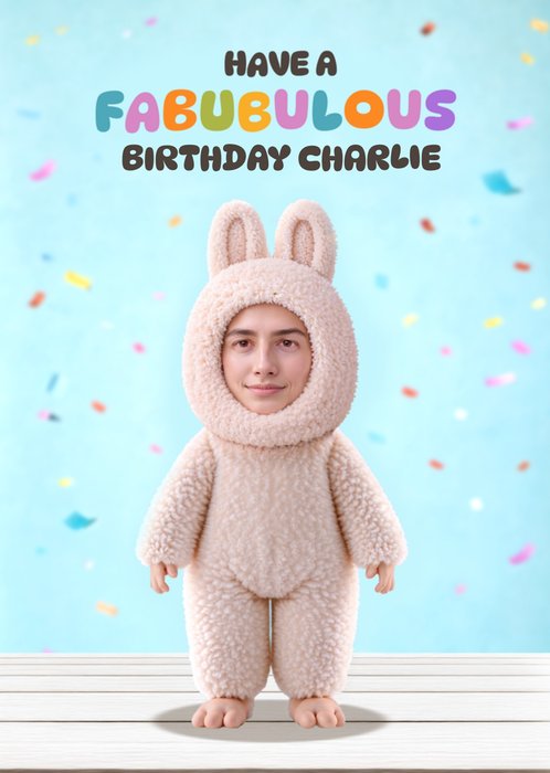 Met een pluizig crèmekleurig konijnenpak met grote oren, geïnspireerd op een populair knuffelbeest, omringd door vallende confetti op een pastelblauwe achtergrond. Met de mogelijkheid om een gezichtsfoto te uploaden.