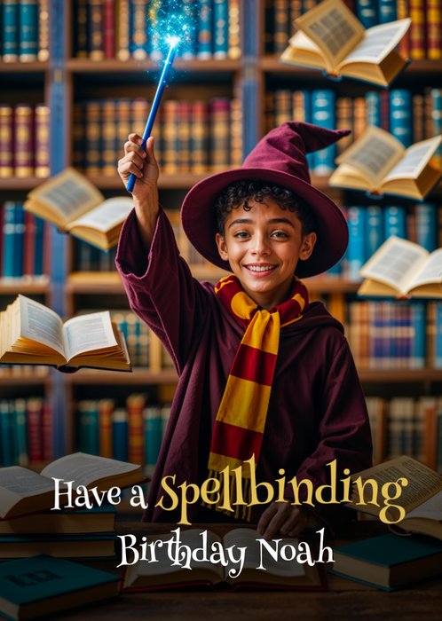 Met een tovenaar die een gloeiende toverstaf vasthoudt, omringd door zwevende open boeken in een bibliotheek tegen een kleurrijke achtergrond. Met de mogelijkheid om een gezichtsfoto te uploaden.