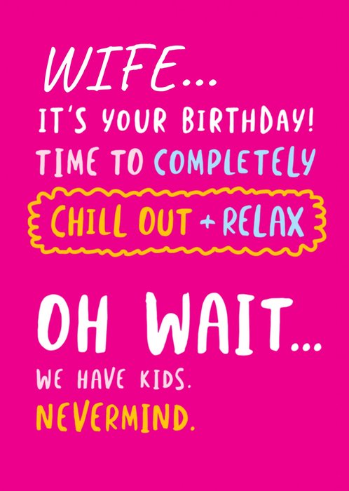 Grappige verjaardagskaart met de tekst: Wife... It's your birthday! Time to completely chill out + relax. Oh wait... we have kids. Mevermind.