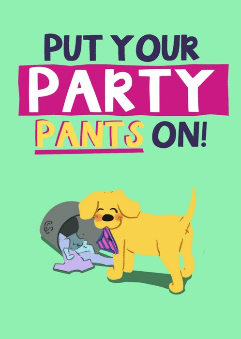Leuke verjaardagskaart met illustratie en de tekst: Put your party pants on!