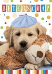 Schattige kaart met een lieve puppy op de kaart die zijn knuffeltje vasthoudt met daarachter allemaal stippen in verschillende kleuren en met de tekst: Beterschap.