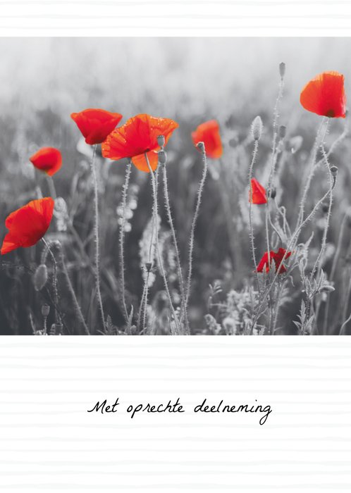 Een zwart-wit kaart waarbij de klaprozen rood zijn afgebeeld. Daarbij staat de tekst: "Met oprechte deelneming."