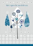Stijlvolle condoleancekaart van TMS, met blauwe bomen op de voorkant en met de tekst: Met Oprecht Medeleven.