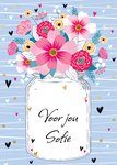 Een vrolijk kaartje met bloemenvaas. Op de bloemenvaast staat de tekst "Voor jou" en de naam is aanpasbaar.