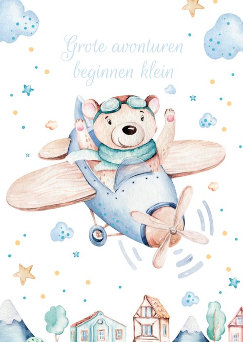 Lief geboortekaartje voor een jongen met een beertje in een vliegtuig daarbij de tekst: "Grote avonturen beginnen klein."