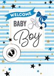 Op dit geboortjekaartje van TMS staat: welcome baby boy. De kaart is versiert met blauwe strepen en sterren.