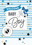 Op dit geboortjekaartje van TMS staat: welcome baby boy. De kaart is versiert met blauwe strepen en sterren.