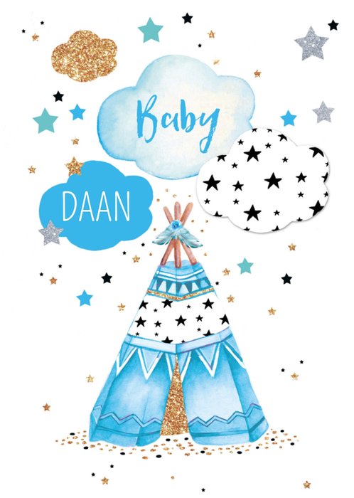 Feliciteer kersverse ouders met de geboorte van hun zoon deze leuke kaart met een tentje en wolkjes..