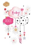 Een meisje geboren? Feliciteer de kersverse ouders met dit geboortekaartje met de roze wolkjes erop!