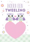 Dubbelfeest met deze uilenkaart. Op het grote paarse hart staan twee uiltjes. Erboven staat 'Hoera een tweeling'. Aan de binnenkant komen de uiltjes terug.