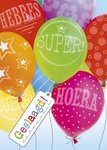 De voorkant van de kaart is gevuld met ballonnen met daarop de tekst, hebbes, super, hoera, geslaagd!