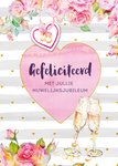 Feliciteer de het koppel met hun huwelijksjubileum. Op de kaart staan fleurige bloemen en een groot roze hart met daarin de tekst: "Gefeliciteerd met jullie huwelijksjubileum."