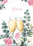 Fleurige huwelijksfelicitatiekaart met klinkende champagneglazen en de tekst: "Proost."