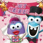 Roze huwelijkskaart van TMS voor een kersvers getrouwd stel en op de kaart staan pas getrouwde monsters op de voorkant.