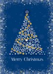 Een klassieke blauwe kerstkaart met een kerstboom, versierd met gouden en witte sterren. Onderaan de kaart staat: 'Merry Christmas.'