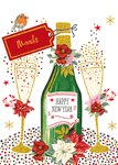 Een feestelijke nieuwjaarskaart met een fles champagne en gevulde glazen waar de bubbels uit springen. De naam op het label is aanpasbaar.