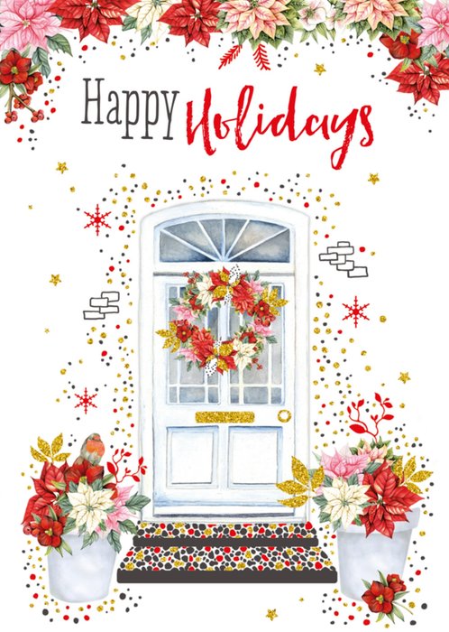 Een romantische kerstkaart om vrienden en familie fijne feestdagen te wensen. Op de voorkant van de kaart staat een gezellig verdierde voordeur met kerstbloemen en sterren eromheen. Boven de deur staat de tekst: 'Happy Holidays.'