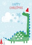 Een leuke kerstkaart van TMS met een dino met een kerstmuts op en de tekst: Happy Christmas.