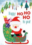 Een vrolijke kerstkaart met een net zo vrolijke Kerstman. Hij zit in zijn arrenslee in de sneeuw en roept 'Happy Ho Ho Ho to you!' naar de ontvanger van deze kaart. Dat wordt een fijne kerst!