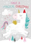 Een leuke kerstkaart van TMS met een unicorn. Ook zie je de tekst: have a magical Christmas.