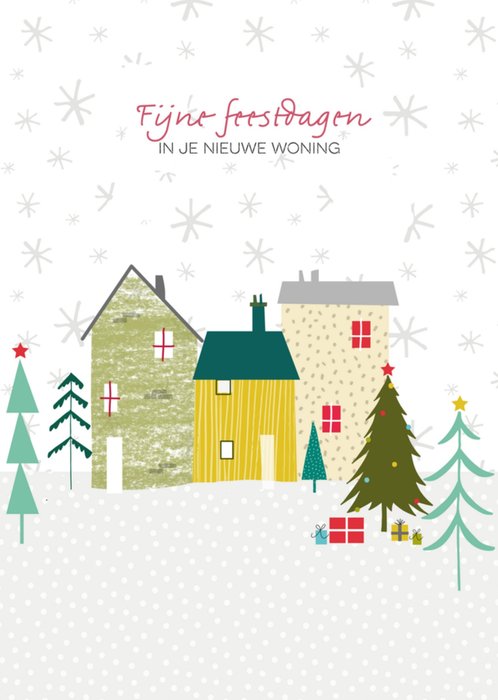 Leuke kerstkaart met illustratie en de tekst: Fijne feestdagen in je nieuwe woning.