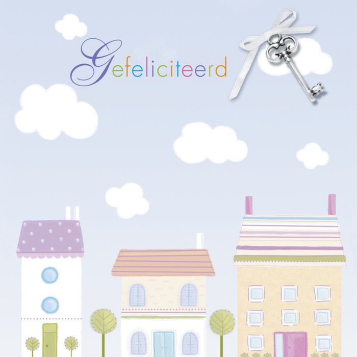 Leuke nieuwe woning kaart met illustratie en de tekst: Gefeliciteerd