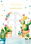 Vrolijke nieuwe woningkaart met cactussen voor de deur en tekst: "Nieuwe woning, gefeliciteerd."