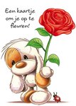 Lieve sterkte kaart met illustratie van een hondje met een roos. Op de kaart staat: Een kaartje om je op te fleuren!