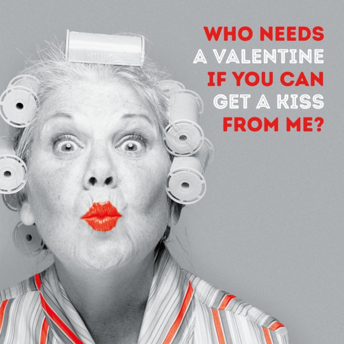 Grappige valentijnskaart met de tekst: Who needs a valentine if you can get a kiss from me?