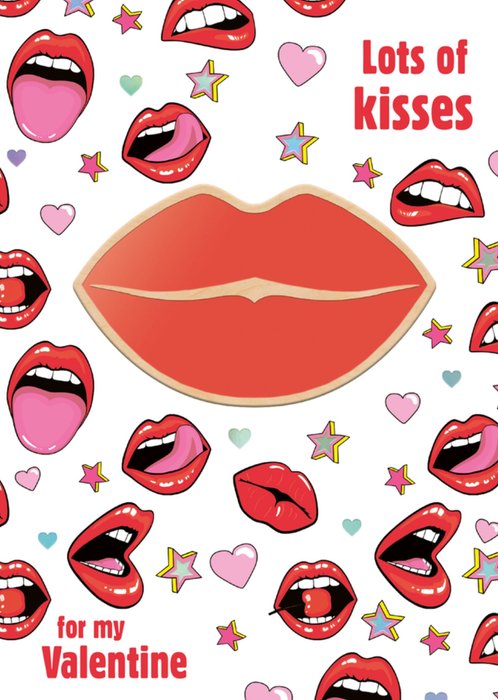 Leuke valentijnskaart met illustratie van lippen en de tekst: Lots of kisses for my Valentine.