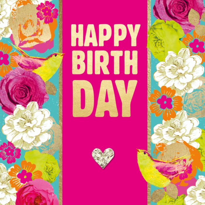 Vrolijke verjaardagskaart met bloemen en de tekst: Happy birthday