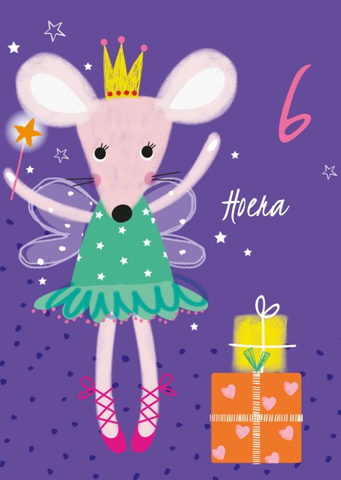 Verjaardagskaart van TMS om iemand die zes jaar oud wordt mee te verrassen. Op de kaart staat een schattige muisje verkleed als elf met een toverstaf in haar handen.